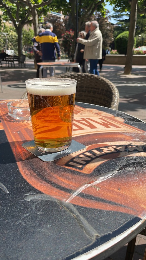 The locals were all sitting outside having coffee, smoking cigars and drinking wine quietly amongst themselves, when I seen a pint of Ambor lager. It seemed to have a halo around it. I went into the cafe and ordered a pint and just sat there in the light shade looking at a statue of General Espartue on his wee horse supping my pint.